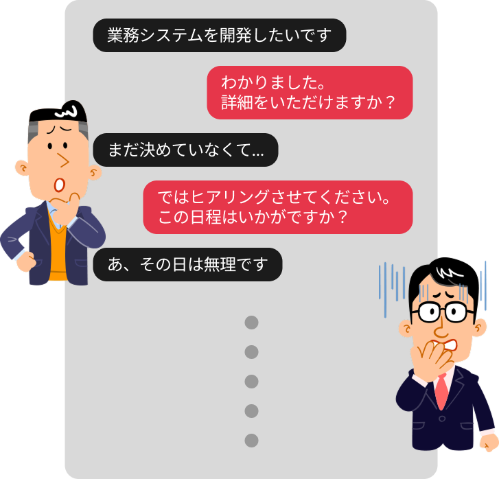 システム開発の詳細を決めたりシステム会社との初回MTGの日程調整したり通常1~2週間かかる作業をわずか簡単3ステップ・5分で完結します。